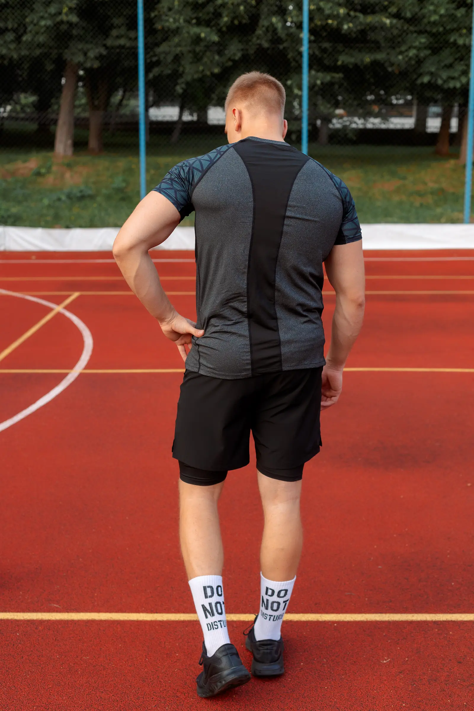 Gym Compression Active Graphite Plus 2w1 to profesjonalny zestaw sportowy stworzony z myślą o intensywnych treningach. Koszulka i szorty z legginsami pod spodem zapewniają komfort, wsparcie mięśni oraz nowoczesny wygląd. Dzięki połączeniu funkcjonalności i stylu to idealny wybór dla wymagających sportowców.
